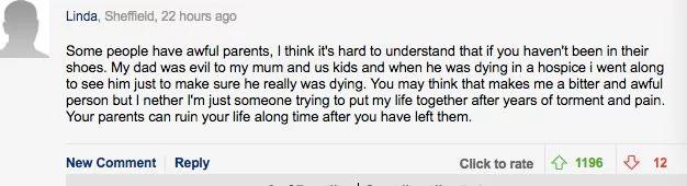 “有些人确实是可怕的父母。如果你没有经历过这样的事情,我觉得你很难理解他们的痛苦。我的父亲一直是我母亲和我们几个孩子的噩梦,所以当他在养老院里临死的时候,我一直有去看他,以确保他真的是快要死了,你可能认为我这种做法十分的可怕和冷血,但是我知道,只有在经历了多年的折磨和痛苦之后,试图把生活重新好好的组织起来,有多么的困难。”