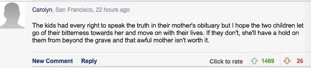 “孩子们完全有权在母亲的讣告中说出真相,但是我希望这两个孩子能够放下他们的痛苦,继续好好的生活,如果他们不这样做的话,他们的母亲会在坟墓之外,抓住他们,控制他们,但这样的母亲不值得毁掉他们的余生。”
