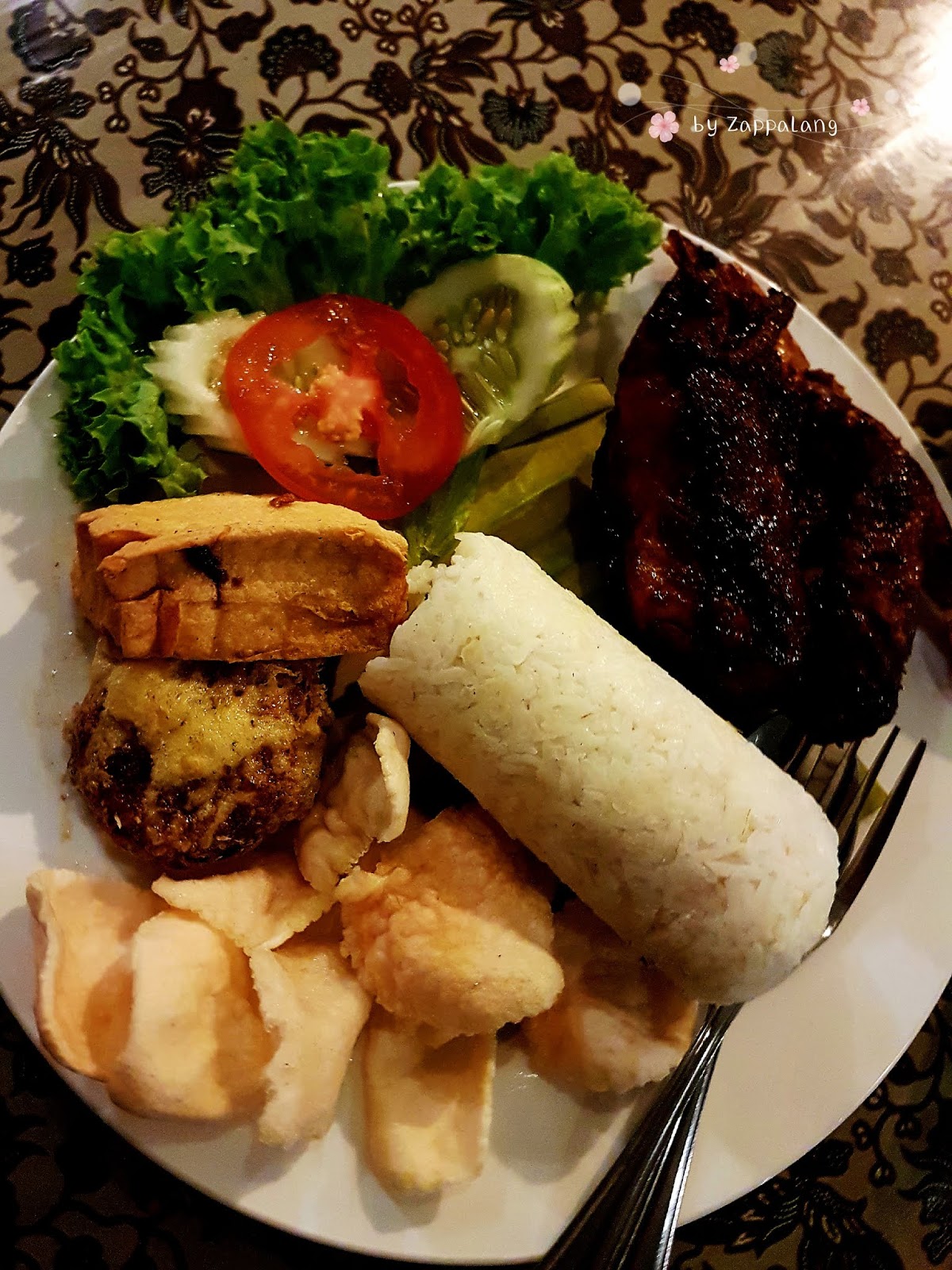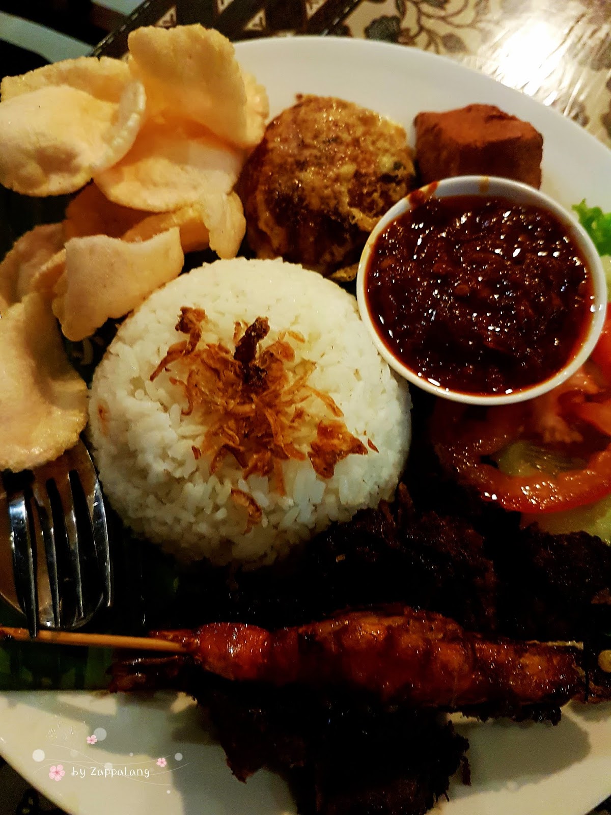 | | Timbel Set- RM19.9 | 这碟最有特色的就是那包在香蕉叶里头蒸熟的香饭,其它的配料有一串烤大虾,烤鸡肉,炸嫩豆腐,马铃薯饼,虾饼等。点套餐的话还包括了一碗汤和饮料。