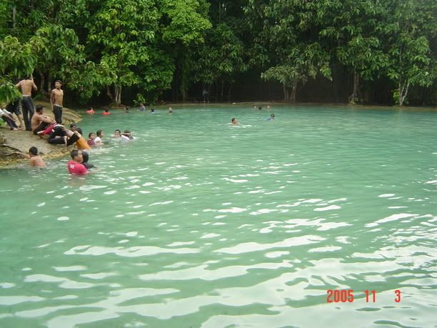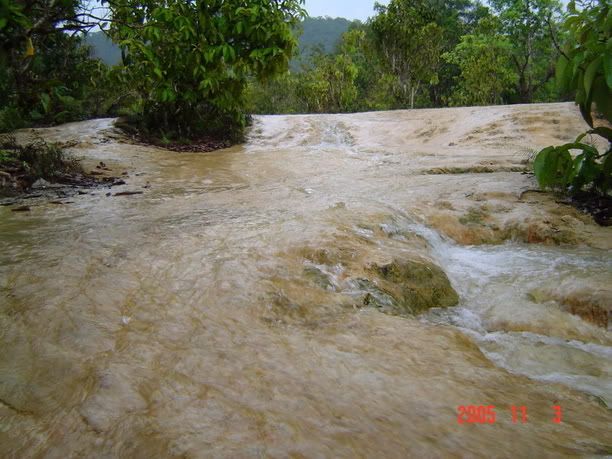 上了車, 下一個目的地是 Hot Spring Stream. 從入口處要步行大約 800 公尺才能看見一個湖. 湖水的顏色是以青和藍為主. 還蠻清澈… 湖水都是由山上流下來的. 領隊說湖水是熱的, 也許是雨天的關係吧... 所以不覺得熱. 也就是因為下著毛毛雨, 害我們走了一路的黃泥路! 鞋子到今天都還沒洗呢!