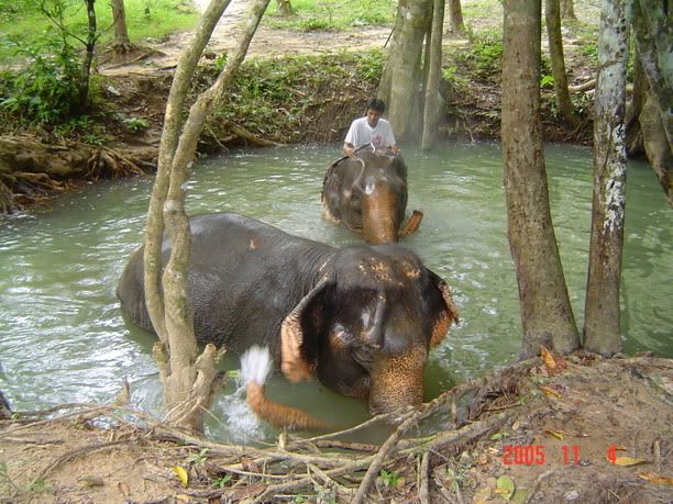 上了巴士又得坐上“久久”才能抵達 Elephant Village. 在這裡有得騎大象越過像膠林及小河, 看大象洗澡以及餵它吃東西. 要騎大象可要付出 THB350! 還真貴耶~! 沒騎過大象的朋友不妨一試. 蠻好玩的.坐在上面的你會搖擺不定, 好像那被你坐著的椅子就要跌下去了! 雖然是有點貴, 但我還是那一句… “都來了嘛~ 要玩就玩得開心點, 不要計較太多.”