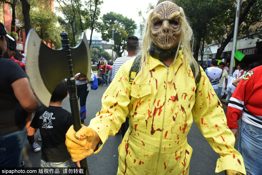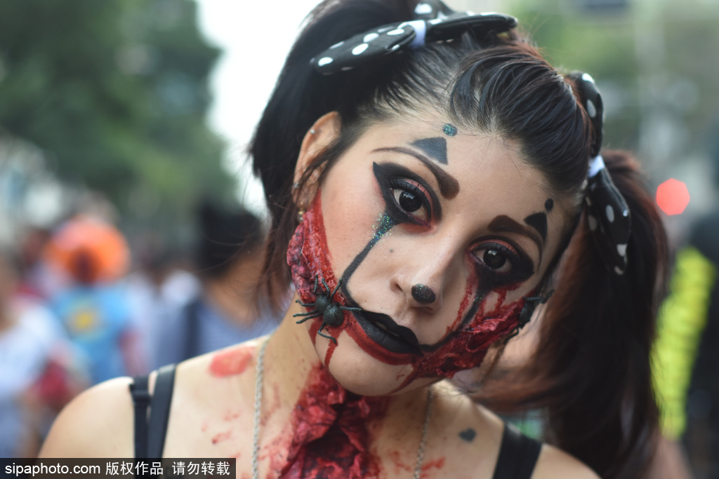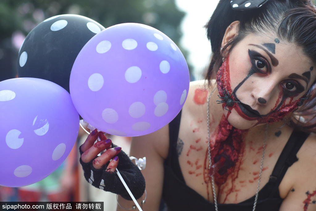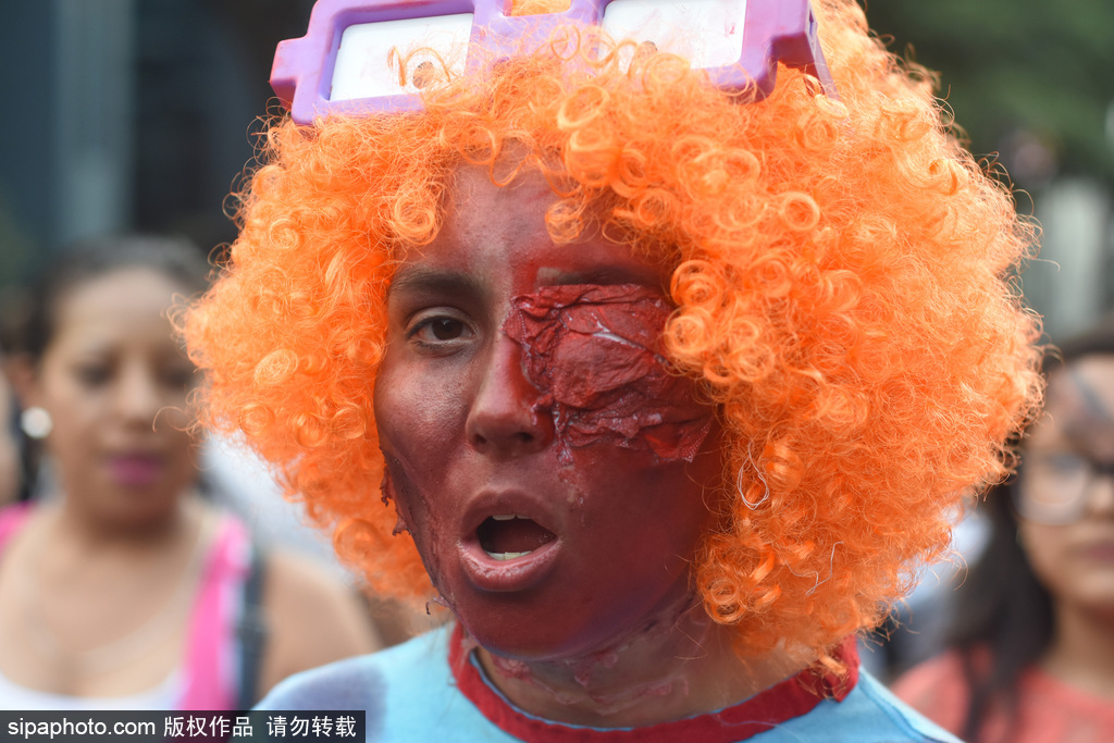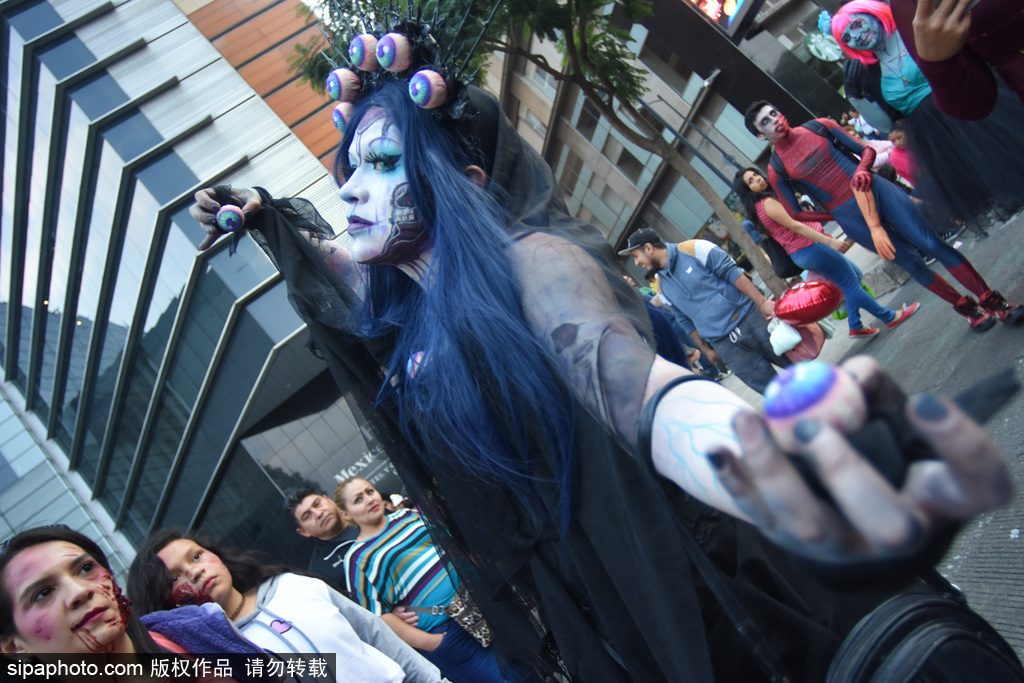 当地时间2018年11月13日讯,墨西哥,在11月11日,墨西哥城举行了第20届一年一度的“僵尸大游行”,人们装扮成怪物的样子走上街头,吓坏了从革命纪念碑到墨西哥城左卡罗的路人们。