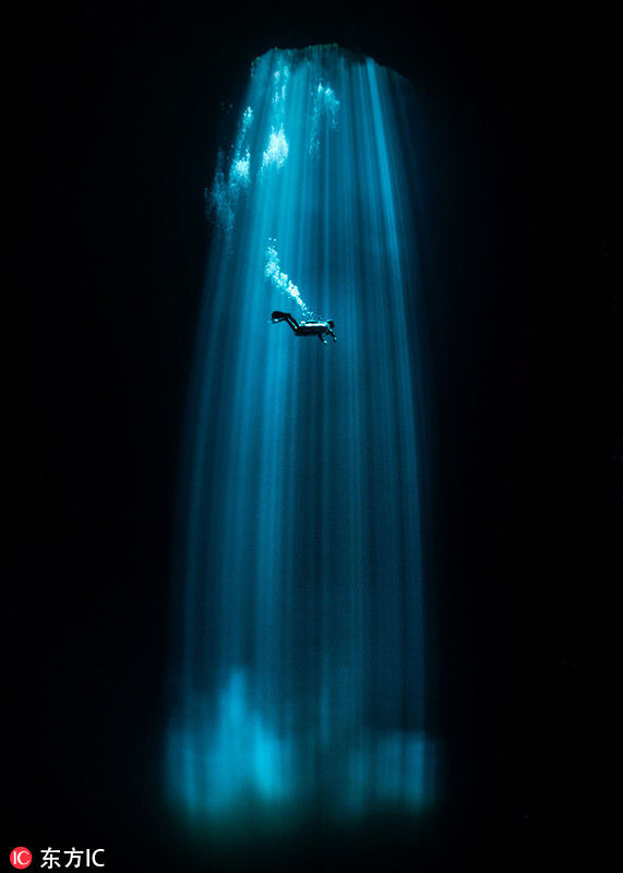 2018年11月16日报道,当潜水员遇到神秘水下洞穴,画面美得不像话! 37岁摄影师Bori Bennett在墨西哥金塔纳罗奥州的洞穴潜水时,拍摄到一组魔幻如世外异境的震撼画面。只见一名潜水者在漆黑的水中徜徉,阳光从洞穴顶部倾泻而下直插洞穴深处,仿佛玛雅文化中的“冥界通道”。位于墨西哥东部金塔纳罗奥州的洞穴是世界上已知的最大水下洞穴,长达347公里。 BoriBennettMercury Press/东方IC