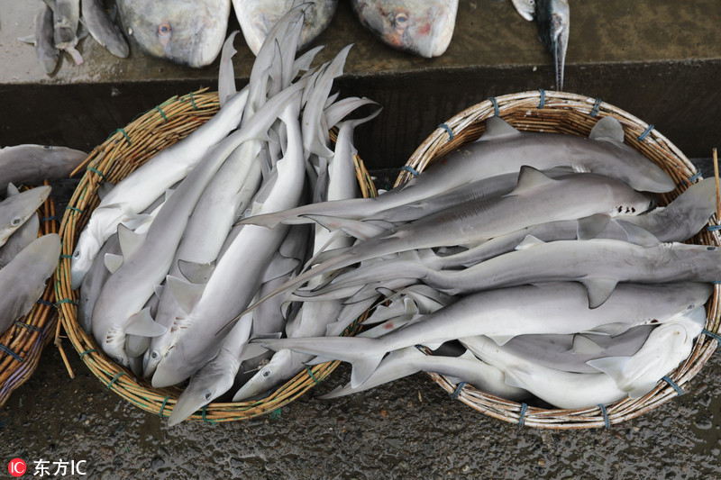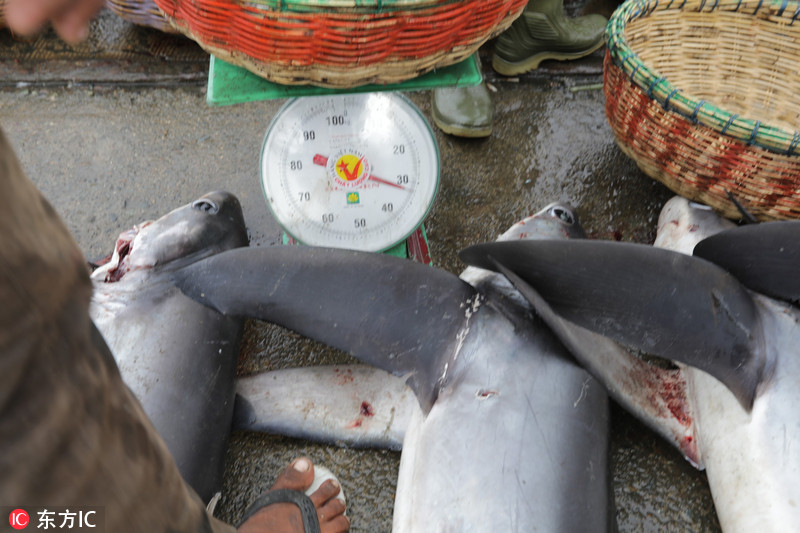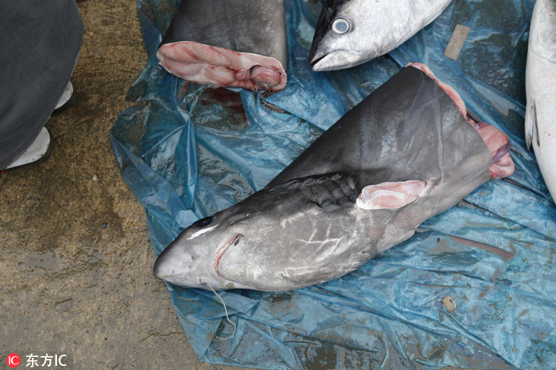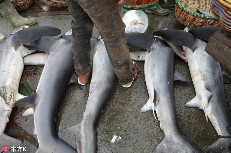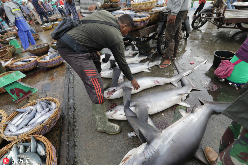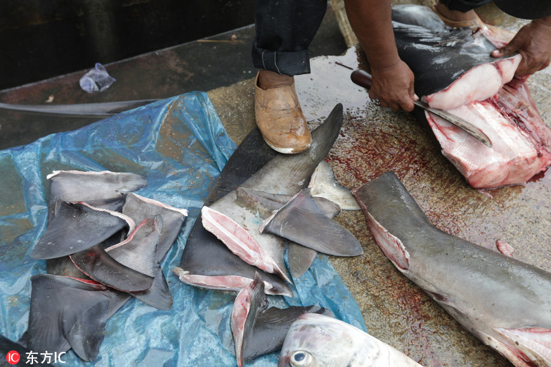 当地时间2018年11月19日,印尼班达亚齐,渔民在Lampulo传统鱼市售卖捕杀到的鲨鱼。 印尼是全球捕鲨最多的国家之一,目前,印尼政府正在加强了对捕捞鲨鱼和蝠鲼的监管力度,由于过度捕捞,这两种生物数量大幅减少,已被列入了《濒危野生动植物种国际贸易公约附录二》。
