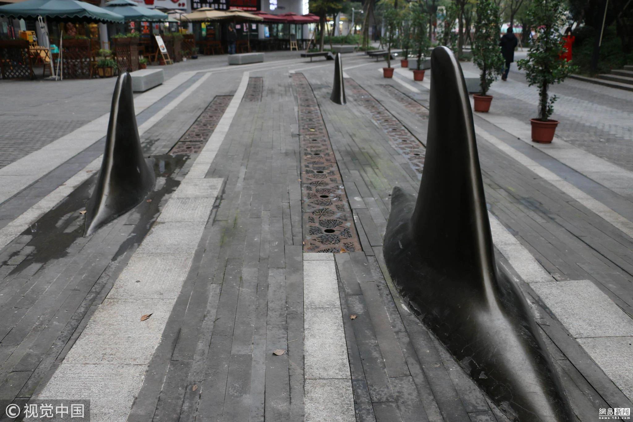 中国重庆马路现“鲨鱼鳍”隔离桩, “吓懵”了路边行人!