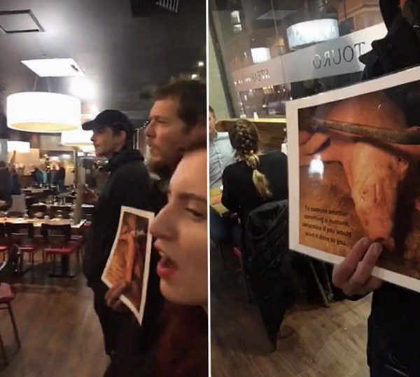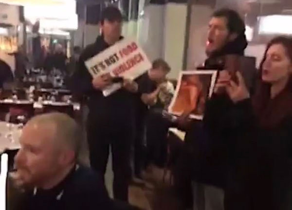 丹•霍姆斯当日就在餐厅用餐,他表示:“抗议可以。他们已经表达了自己的观点就该离开,让客人用餐,可他们还播放那种音频,这很过分。有一个人围着餐桌转来转去,不停地拍食客吃东西,以及素食主义者示威的场面。”据悉,示威者在这家店逗留了20分钟后,又在店外示威长达一个小时。