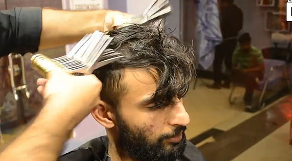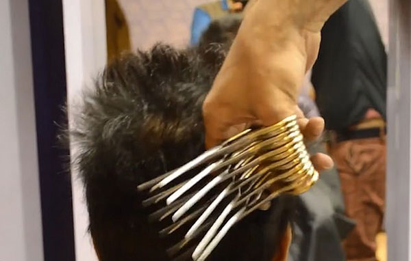 巴基斯坦神奇理发师 同时用27把剪刀为客理发(视频)