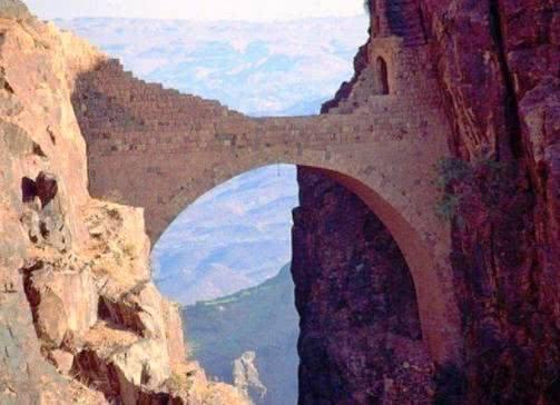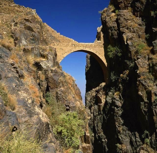 沙哈拉之桥坐落在也门的阿姆兰省沙哈拉村的进口,整座桥悉数由石灰石创作创造,这座桥位于两座山之间百米深的峡谷之上,海拔高达2000多米,桥长约20米,宽约3米左右,因为旁边是山和大峡谷,颇有山水桥的意思,但是很多人看过这座桥都会惊叹这座桥的宏伟,所以大家也称这座桥为叹息之桥。