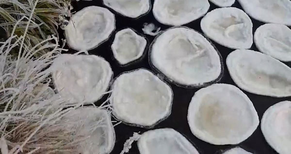 当地气象局表示,“冰煎饼”的形成需要非常特殊的条件,在波罗的海和北美比较常见。河流上的泡沫被冻结后结合在一起,遇到旋涡的时候就变成了圆形。虽然“冰煎饼”看起来像实心的圆盘,但实际上非常脆弱,在拿起来的时候很容易破裂。