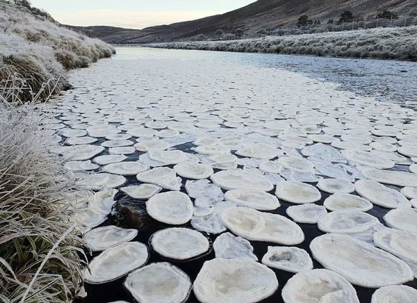 12月5日,丹尼尔驱车穿过苏格兰基尔多南的斯特拉斯的途中看到这一景象并产生了巨大的兴趣,他让同事靠边停车后细细观察这此前从未见到的风景。来自苏格兰的丹尼尔说:“我对它很感兴趣但也很迷惑它是如何形成的,我知道它们叫‘冰煎饼’,但我觉得比起煎饼,它们更像虾片。它们大小各异,有的像DVD,有的如黑胶唱片大小。我曾拍摄冬日日出的照片,也拍过十分出色的照片,但从未拍过如此独特的景象。”