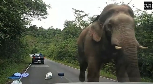 坐在皮卡车后面的一辆汽车副驾驶座上的乘客拍摄了相关视频,画面显示,这头饥饿的大象正用鼻子在皮卡车的后备箱里翻箱倒柜地寻找食物,皮卡车司机和乘客们则安静地坐在车内,生怕惹怒大象,造成严重的后果,只好任其“抢劫”。