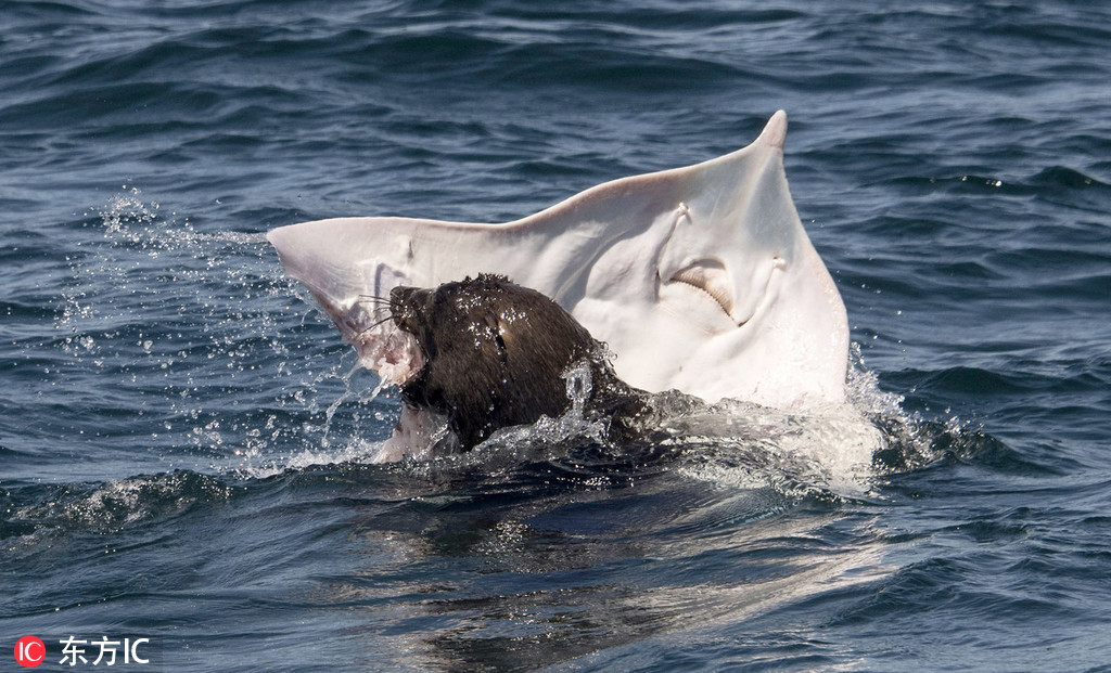 摄影师David Hurwitz在南非开普敦海域听到水下传来一阵骚动声,他以为是鲨鱼在捕食海豹,连忙端起镜头赶往事发地,然而到场才发现,海豹并非他所以为的被食者,反而是异常凶猛的捕食者! 这头海豹在水下捕食一只倒霉的黄貂鱼,对着它蒲扇一样的身子大口撕咬,同时还一脸愤怒驱赶想要分一杯羹的水鸟,不一会就将黄貂鱼整个吞下了肚。