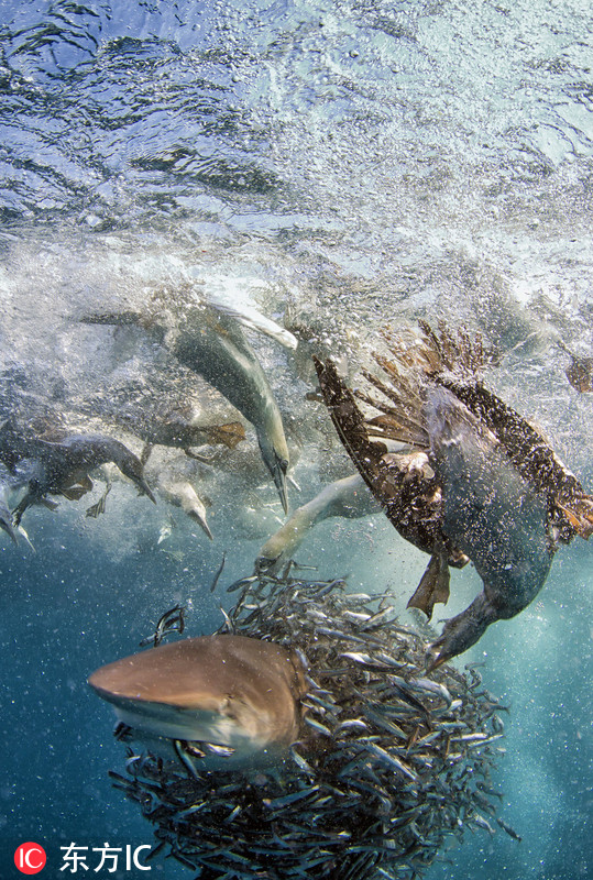 南非摄影师Allen Walker在沙丁鱼迁徙潜入海底,捕捉到了一组令人震撼的画面。只见画面中,数不胜数的沙丁鱼抱团保护自己,在海底形成密密麻麻的圆圈。而它们面临的捕食者不是不止是鲨鱼,还有如炸弹般俯身冲入水中的塘鹅。可怜的沙丁鱼们就这么被鲨鱼群和塘鹅围攻着,生动演绎着海洋生物链的弱肉强食。