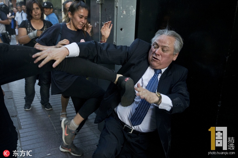当地时间2018年12月19日,智利圣地亚哥,智利宪法法院当天就违反人权罪的犯人是否应当享有有条件的自由权利进行辩论,示威民众在场外抗议,智利宪法法院院长Ivan Arostica在离开法院后遭抗议人群拳打脚踢。