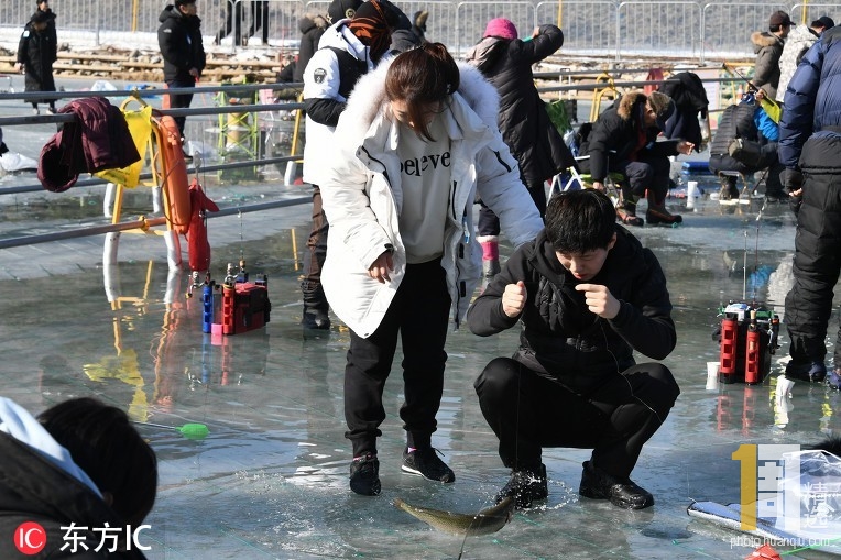 当地时间2018年12月22日,韩国江原道平昌郡,第12届平昌鳟鱼庆典开幕,民众冰上垂钓抓鳟鱼。当天开幕的庆典吸引了3万多人,盛况空前。