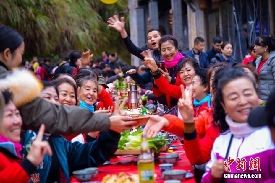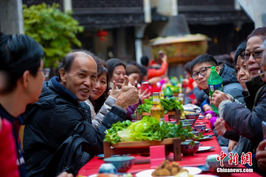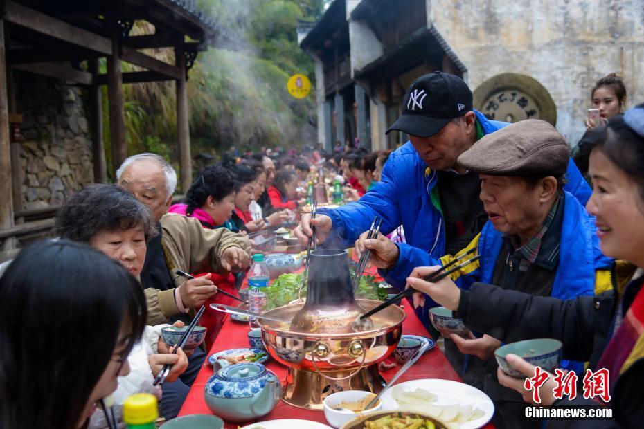 巨型火锅亮相江西古村 海内外宾客分享百米长桌火锅宴