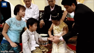 今年6岁的吉他(Guitar)与奇薇(Kiwi)上周在泰国曼谷举行盛大且奢华的婚礼,他们的亲友、朋友、邻居皆出席庆祝,据估计这场婚礼花费约数十万台币。他们的父亲阿蒙珊(Amornsan Sunthorn Malirat)表示,遵循过去传统,这两个孩子前世是一起生活的伴侣,我们必须替他们举办结婚仪式,以解决他们转事前所遇到的问题,并祈求他们今生过着健康且幸福的生活。在传统仪式中,穿着五颜六色衣服的宾客会在街上游行、跳着舞、演奏着乐器,然后吉他穿过象征吉兆的9道门,在妹妹脸颊上留下一吻。