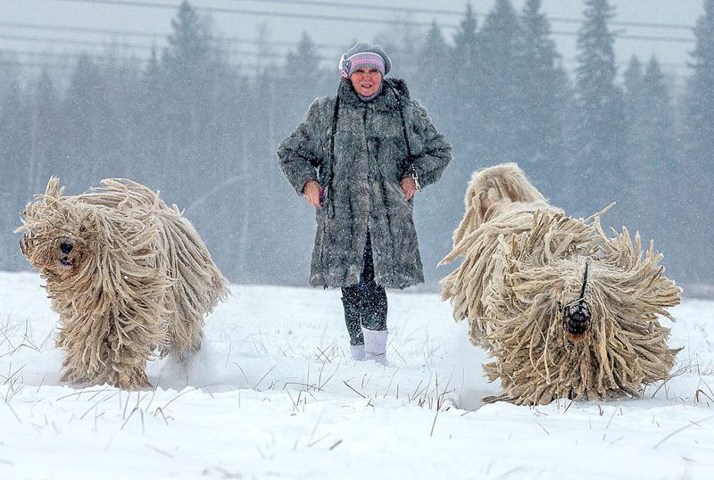 这组照片拍摄于俄罗斯特佛州科纳科夫斯基区一个国家保护区——扎维多沃村。从照片中可以看到两只狗狗在雪地里奔跑玩耍,十分开心。科蒙多尔犬是一种看护犬,它们毛发浓密,像绵羊一般。伊戈尔说:“为这种狗拍照很辛苦,因为它们平日负责防守领地,所以一旦有人试图靠近,它们立刻就会显示出攻击性。”