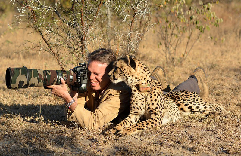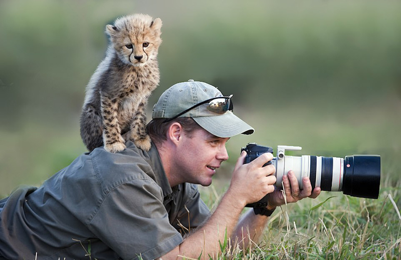 摄影师斯图•波特(Stu Porter)在拍摄时,被一只胆大的猎豹幼崽趴在他的肩膀上的画面。
