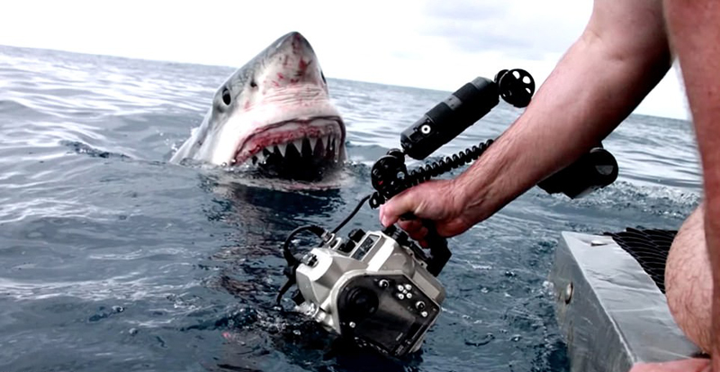 摄影师戴夫•里格斯(Dave Riggs)拿着相机站在一头张开大嘴、露出尖牙的大白鲨面前的一刻