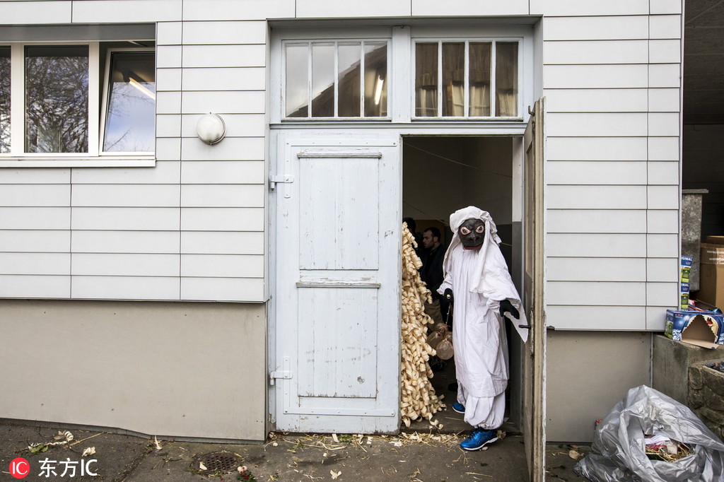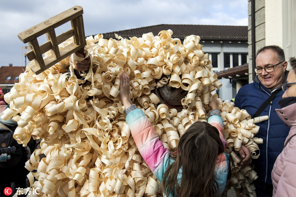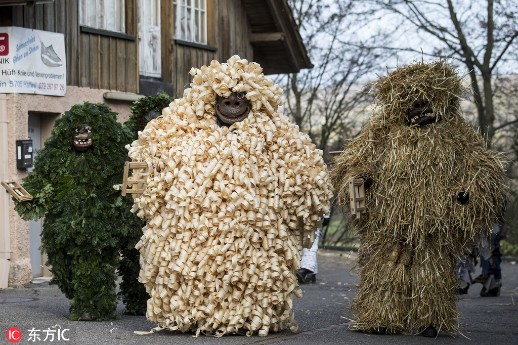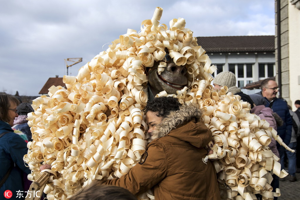 当地时间2019年1月2日,瑞士哈尔维尔,当地举办传统Baerzelitreiben活动迎接新年,15名年轻男子扮成Baerzeli的样子,拥抱民众送祝福。人们认为获得Baerzeli扎人的拥抱,或者是被猪膀胱击中会带来好运。