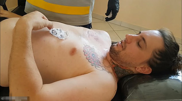 就这样到了收尾阶段,纹身师用纸巾擦去客户身上多余的墨迹。最后,在顾客胸口放上了一块纸巾,隔着它喷洒了一些液体,重新擦拭了一遍,大功告成。