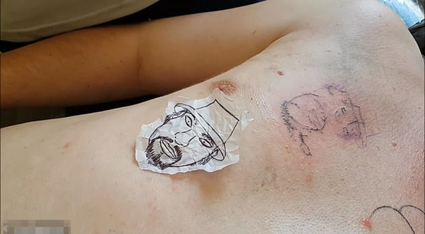 这位纹身艺术家挑战的任务是在一名男顾客身上纹一张脸,事先,这名男顾客已经提供了一张图片模板供他参考,上面画着一个戴帽子的大胡子男子,于是他便开始了挑战。
