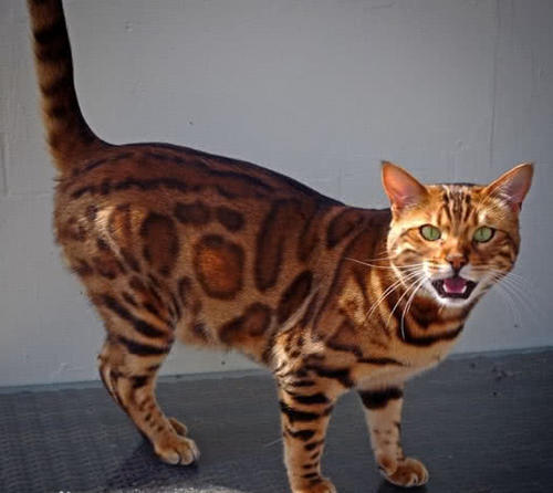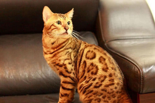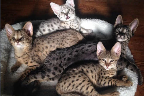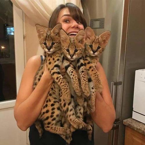 6萨凡纳猫 又名热带草原猫(学名:Felis catus × Leptailurus serval),英文名称Savannah cat,所以又译作”萨凡纳猫“,“Savannah”的中文意思是“热带草原”。是由非洲薮猫(父系)与家猫(母系)杂交而成。体重约为8-15千克。