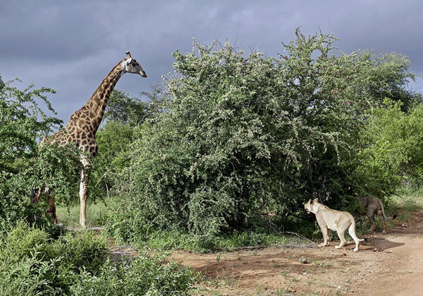 然而,背有猛兽、后有“追兵”的困境并没有让长颈鹿“缴械投降”,它使出浑身的力量不断踢逐着狮子,并将背上的狮子甩了下来。狮群不断靠近意欲再度发起攻击,长颈鹿及时发现后进行了强力防御。