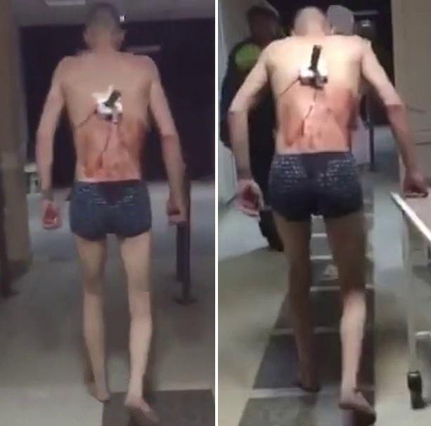 据悉,事情发生在喀山泽廖诺多利斯克区医院,这名男子名叫弗拉基米尔,现年34岁。根据视频,他仅穿内裤,赤脚走在医院走廊上。后背只见刀柄,简单包扎后仍在流血。一位女护士在他身后问道:“弗拉基米尔,你要去哪儿?还要走多远?外面很冷,快回来。”该男子回身答道:“去抽支烟。”然后径直向前走,丝毫没有回头的意思。