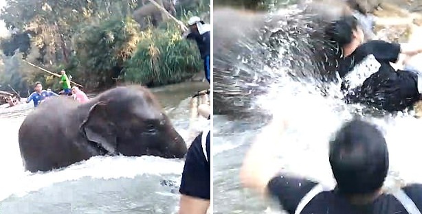 泰国狂暴大象冲向漂流木筏 游客全被撞入水中成“落汤鸡”(视频)