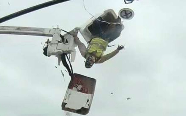 美国电线修理工人高空作业时被货车剐倒 惊险倒悬空中(视频)