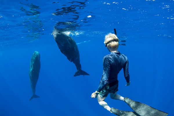 和迈克在一起的还有自由跳水冠军伊琳娜•斯摩棱塞娃(Irina Smolentseva)。这段简短的视频显示,四头抹香鲸懒洋洋地漂浮在水下,而伊琳娜戴着潜水面罩,穿着脚蹼,漂浮在一旁,近距离地观察着它们。