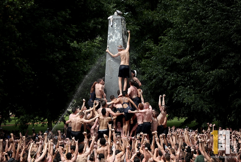 当地时间2019年5月20日,美国马里兰州安纳波利斯,安纳波利斯海军学院的新生攀爬赫恩登纪念碑(Herndon Monument)。这项活动创始于1940年,每年该校新生都要攀上涂满猪油的纪念碑来更换碑顶的海军帽。