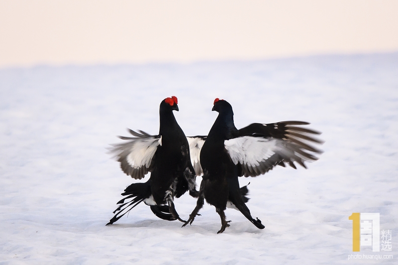 当地时间2019年5月23日,瑞士沃州维尔拉附近,正值动物求偶季,当地两只黑琴鸡在雪地上嬉闹仿佛在跳“双人舞”。