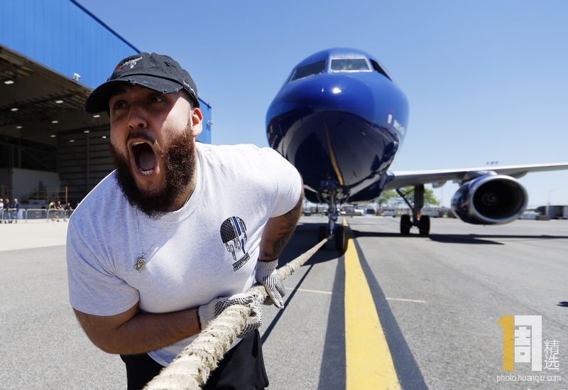 当地时间2019年5月21日,美国纽约,捷蓝航空公司举办第十届拉飞机慈善比赛。19个参赛团队齐聚纽约肯尼迪机场,比拼以最快的速度,将一架空客320飞机拉动100英尺(30.48米)。