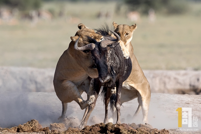 2019年5月22日报道,英国摄影师苏-莫里斯(Sue Morri)在博茨瓦纳Nxai Pan国家公园游玩,目睹了一场凶恶母狮猎食角马的画面。母狮甚至攀到了角马背上,想要牢牢遏制住到手的“美餐”。强壮的角马努力地与母狮抗争,竭力想要保住自己的性命,但最终还是不敌母狮被拿下,最后成了母狮孩子们的盘中餐。