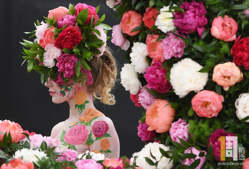 当地时间2019年5月20日,英国伦敦,切尔西花展媒体日,一名模特站在一花卉展览旁,摆着pose让摄影师拍照。