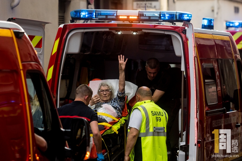 当地时间2019年5月24日,法国里昂,当地时间24日下午,法国第三大城市里昂市中心一条步行街发生爆炸,截至目前已造成包括一名儿童在内的13人受伤。巴黎检方反恐部门已介入调查。图为一名受伤老人被抬上救护车。