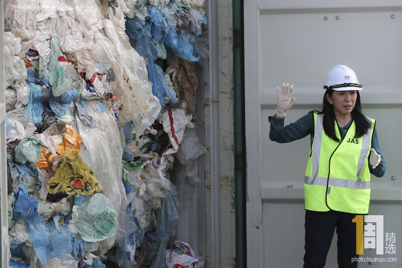 当地时间2019年5月28日,马来西亚巴生港,马来西亚能源、科学、科技、气候变化及环境部长杨美盈(Yeo Bee Yin)向媒体展示装在集装箱里的塑料垃圾。据美联社5月28日报道,为避免成为富裕国家的垃圾场,马来西亚能源与环境部部长杨美盈周二宣布了将垃圾运回的计划,将目前在马来西亚港口的3300吨塑料垃圾运回源头国。这些垃圾被装在60个集装箱中,将被运送至英国、北美、日本和沙特等国,其中10个集装箱预计在两周内离开。