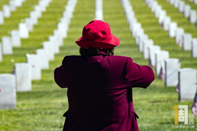 当地时间2019年5月27日,美国,阵亡将士纪念日当天,一名女子在洛杉矶国家公墓望着墓碑。