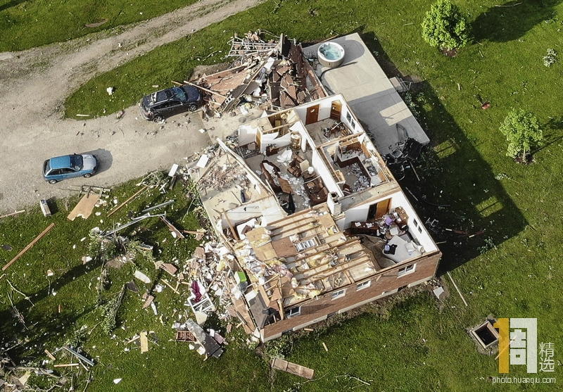 当地时间2019年5月28日,美国俄亥俄州布鲁克维尔,龙卷风袭击当地造成破坏,房屋建筑被毁,树木倾倒,一片狼藉。