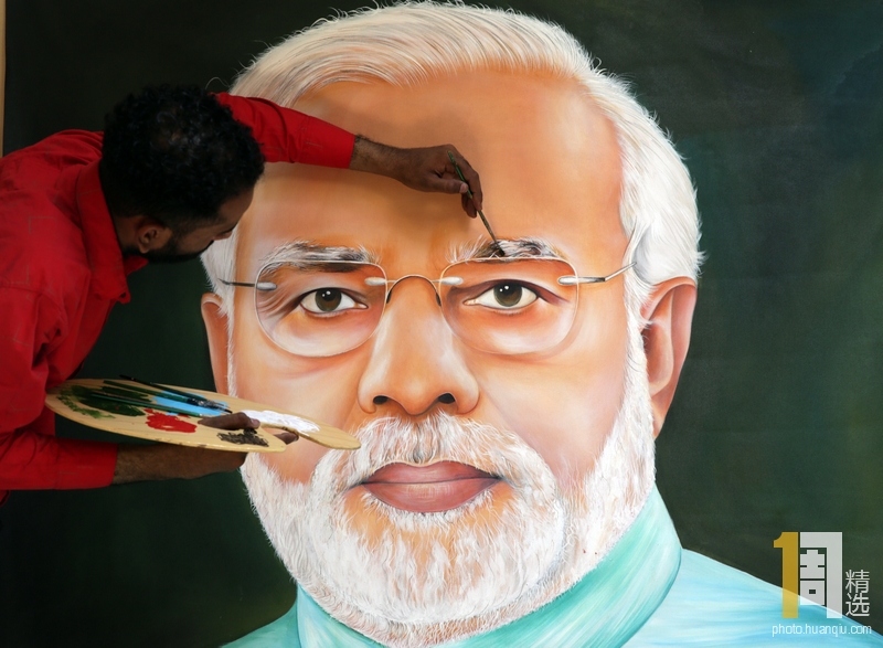 当地时间2019年5月29日,印度阿姆利则,印度总理莫迪将于5月30日再次宣誓就任总理,29日,当地艺术家Jagjot Singh Rubal绘制巨幅莫迪画像,表达良好的祝愿。