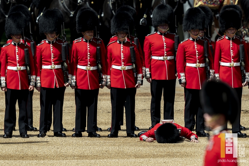当地时间2019年6月1日,英国伦敦,英国皇家骑兵卫队为迎接美国总统特朗普的出访进行阅兵式彩排,士兵在排练时晕倒在地。