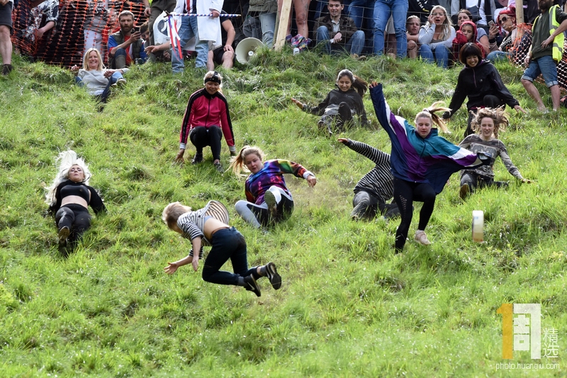 当地时间2019年5月27日,英国格洛斯特郡Brockworth,当地举办一年一度的滚奶酪大赛,参赛者争先恐后从山坡上翻滚而下追逐一块奶酪,甚至有参赛者不惜为此受伤。