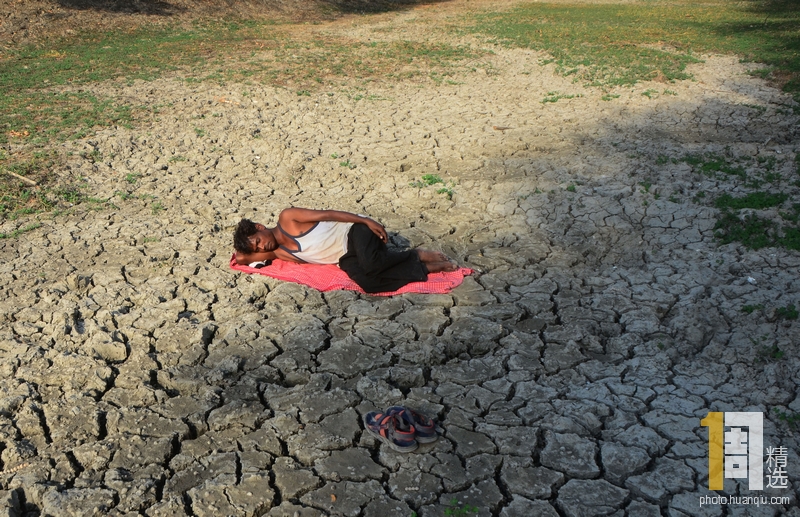 当地时间2019年6月8日,印度北方邦阿拉哈巴德县普尔布尔,Varuna河因高温干旱缺水,一名当地躺在干涸的河床上睡觉。