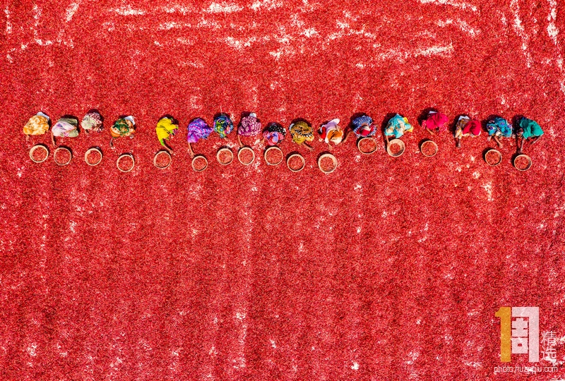 2019年6月7日报道,摄影师Abdul Momin拍摄孟加拉国Bogura的农场上,工人在烈日下晒辣椒的场景。图片中,鲜红的辣椒铺满地犹如大红色的地毯,壮观极了。
