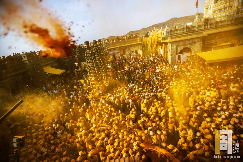 当地时间2019年6月3日,印度哈拉施特拉邦浦那县杰久里,纪念湿婆神的宗教节日“新月节“(Somvati Amavasya)庆祝活动在Khandoba神庙举行,漫天姜黄粉末飞扬分外壮观。