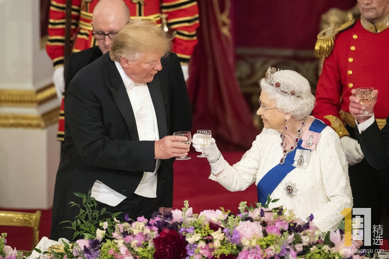 当地时间2019年6月3日,英国伦敦,英国女王伊丽莎白二世在白金汉宫举行国宴,招待来访的美国总统特朗普,100多名宾客参加宴会。