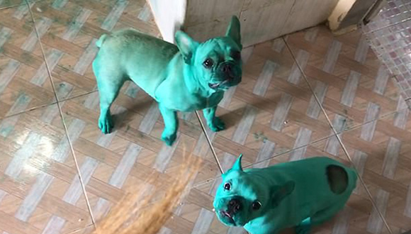 两只狗狗的主人雅达(Yada Ornsomjit)说:“前一晚我忘了关厨房门,但我不敢相信它们竟然溜进了厨房,还把所有的东西染成了绿色 ,色素粉末洒满了厨房的地板和房子四周。我和丈夫花了半天时间,将两只狗狗洗了三遍,他们身上的有些部位仍旧是一片绿色,但它 们似乎并不知道自己做错了什么。”